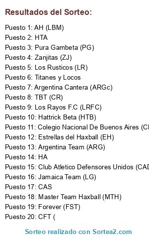 Lista de participantes: Forever (FST), Jamaica Team (LG), HA, Argentina Team (ARG), CFT (, Pura Gambeta (PG), Los Rusticos (LR), Titanes y Locos, HTA, Estrellas del Haxball (EH), TBT (CR), Argentina Cantera (ARGc), Zanjitas (ZJ), Colegio Nacional De Buenos Aires (CNBA), Hattrick Beta (HTB), AH (LBM), Los Rayos F.C (LRFC), Master Team Haxball (MTH), CAS, Club Atletico Defensores Unidos (CADU).