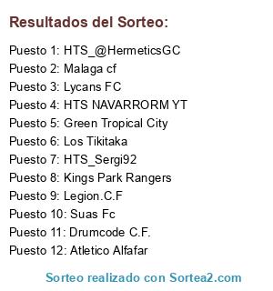 Lista de participantes: HTS_Sergi92, Lycans FC, Drumcode C.F., Green Tropical City, Malaga cf, Atletico Alfafar, Suas Fc, HTS_@HermeticsGC, HTS NAVARRORM YT, Kings Park Rangers, Legion.C.F, Los Tikitaka.