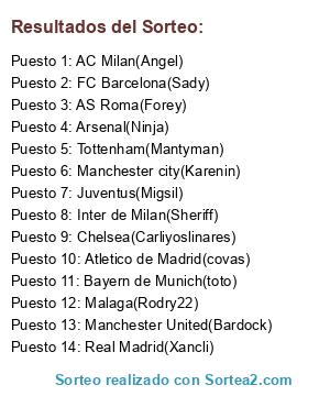 Lista de participantes: AC Milan(Angel), Inter de Milan(Sheriff), AS Roma(Forey), FC Barcelona(Sady), Malaga(Rodry22), Real Madrid(Xancli), Bayern de Munich(toto), Tottenham(Mantyman), Manchester United(Bardock), Chelsea(Carliyoslinares), Arsenal(Ninja), Juventus(Migsil), Manchester city(Karenin), Atletico de Madrid(covas).