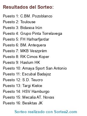 Lista de participantes: FH Hafnarfjardar, BM. Antequera, Bidasoa Irún, Haslum HK, HSV Hamburgo, RK Cimos Koper, Mecalia AT. Novas, MKB Veszprèm, Grupo Pinta Torrelavega, S.D. Teucro, Targi Kielce, Besiktas JK, Amaya Sport San Antonio, Escubal Badajoz, C.BM. Pozoblanco, Toulouse.