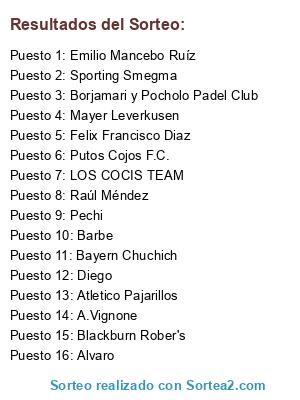 Lista de participantes: Borjamari y Pocholo Padel Club, Alvaro, Raúl Méndez, LOS COCIS TEAM, Putos Cojos F.C., Barbe, Felix Francisco Diaz, Diego, A.Vignone, Blackburn Rober's, Sporting Smegma, Pechi, Emilio Mancebo Ruíz, Bayern Chuchich, Atletico Pajarillos, Mayer Leverkusen.