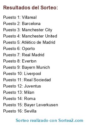 Lista de participantes: Roma, Real Madrid, Real Sociedad, Atlético de Madrid, Barcelona, Oporto, Bayer Leverkusen, Juventus, Liverpool, Bayern Munich, Milan, Everton, Villareal, Sevilla, Manchester City, Manchester United.