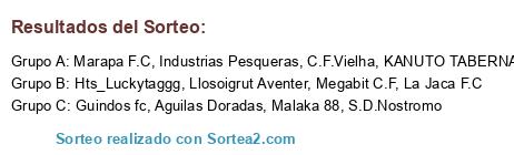 Lista de participantes: KANUTO TABERNA, Megabit C.F, Malaka 88, Aguilas Doradas, Marapa F.C, Industrias Pesqueras, Hts_Luckytaggg, La Jaca F.C, Guindos fc, S.D.Nostromo, Llosoigrut Aventer, C.F.Vielha.