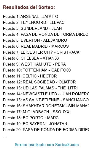 Lista de participantes: OLYMPIQUE LYON - JBECERRIL06, REAL MADRID - MARCOS, RIVER PLATE - SIN MANAGER, CHELSEA - XTIAN33, EVERTON - ALEJANDRO, FC BAYERN - JONATAN, FIORENTINA - DENIABLEMEAT, NEWCASTLE UTD - JUAN ROMERO, SHAKHTAR DONETSK - SIN MANAGER, BOR. DORTMUND - MOYA, FC PORTO - MARC, ARSENAL - JAIMITO, RC DEPORTIVO - GONZALO, AS SAINT-ETIENNE - SANGUANGOO, JUVENTUS - JUAN CARLOS, RSC ANDERLECHT - CARLITOS, REAL BETIS - YOYITO88, VALENCIA CF - JAIME9LOZANO, VFL WOLFSBURGO - MARS89, VILLARREAL CF - JOSUELP88, AS MONACO - ISAACV, REAL SOCIEDAD - OLIATOR, RC CELTA - CENTOLLITO88, NAPOLES - VALVERDE0014, FC BARCELONA - PEDROLAGAR, SEVILLA FC - DERLI36, FEYENOORD - LLBPAC, MILAN - AGOMEZ, ATLETICO MADRID - GUITARRERO18, BAYER 04 - ANTOBEL_MM, GIRON. BURDEOS - PEDRINHO10_UD, LAZIO - JOTA, AJAX - DIEGOPBLT13, ROMA - JORDYCF, PSG - AYO83XBOX, O. MARSELLA - CAMPIRANO1784, SUNDERLAND - JUAN, SPORTING CP - EGIDO98, WEST HAM UTD - PERA, VFB STUTTGART - SIN MANAGER, PSV - SIN MANAGER, LEICESTER CITY - CRISTRACK, MANCHESTER UTD - SACRO, INTER DE MILAN - JOSECARHUM, MANCHESTER CITY - STOIKA XONDO, LEVANTE UD - OLMO24, ATHLETIC CLUB - XAVYGORRONAL, BOCA JUNIORS - SIN MANAGER, CELTIC - HECTOR, MALAGA CF - ELIBI, M GLADBACH - SSOUXX, OLYMPIACOS CFP - SIN MANAGER, SL BENFICA - SERGIS, PANATHINAIKOS - VIIC86, SAMPDORIA - PABLOGARCIAVERA, RCD ESPANYOL - ALEX-4444, TOTTENHAM - GABITO09, UD LAS PALMAS - THE_LITRI, LIVERPOOL - ALPERSIE, WERDER BREMEN - MASCAO7, PASA DE RONDA DE FORMA DIRECTA 1, PASA DE RONDA DE FORMA DIRECTA 2, PASA DE RONDA DE FORMA DIRECTA 3, PASA DE RONDA DE FORMA DIRECTA 4.