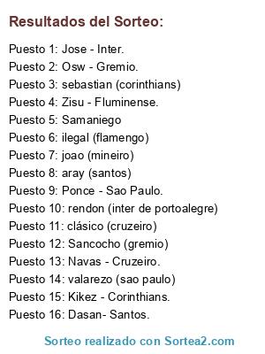 Lista de participantes: Kikez - Corinthians., Dasan- Santos., Zisu - Fluminense., Jose - Inter., Osw - Gremio., Navas - Cruzeiro., Ponce - Sao Paulo., Samaniego, Sancocho (gremio), joao (mineiro), clásico (cruzeiro), sebastian (corinthians), valarezo (sao paulo), aray (santos), rendon (inter de portoalegre), ilegal (flamengo).