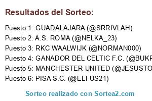 Lista de participantes: GANADOR DEL CELTIC F.C. (@BUKRON00) VS RCD ESPANYOL (@PESADILLA21181), GUADALAJARA (@SRRIVLAH), A.S. ROMA (@NELKA_23), MANCHESTER UNITED (@JESUSTORRESS), RKC WAALWIJK (@NORMAN000), PISA S.C. (@ELFUS21).
