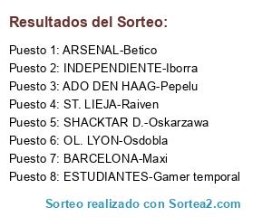Lista de participantes: ST. LIEJA-Raiven, BARCELONA-Maxi, INDEPENDIENTE-Iborra, ADO DEN HAAG-Pepelu, SHACKTAR D.-Oskarzawa, OL. LYON-Osdobla, ARSENAL-Betico, ESTUDIANTES-Gamer temporal.