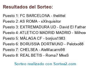 Lista de participantes: AS ROMA - xXInquisitor, EXTREMADURA UD - David El Father, BORUSSIA DORTMUND - Pelotxo88, REAL BETIS - Roma7 MkeS, ATLETICO MADRID MADRID - Milhosevich, CHELSEA - AleMacarro98, FC BARCELONA - thelittel, MÁLAGA CF - borjius1983.