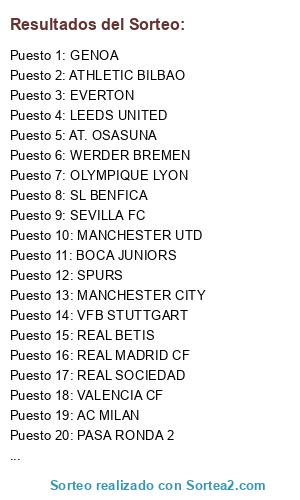 Lista de participantes: A. VILLA, AT. OSASUNA, ATHLETIC BILBAO, ATLETICO MADRID, BOR. DORTMUND, CHELSEA, FC BARCELONA, GETAFE CF, HAMBURGER SV, LEEDS UNITED, LIVERPOOL, MANCHESTER CITY, REAL MADRID CF, SEVILLA FC, SPORTING CP, SPURS, VALENCIA CF, VFB STUTTGART, VFL WOLFSBURG, VILLARREAL CF, AJAX, ARSENAL, AS ROMA, BOCA JUNIORS, EVERTON, FC BAYERN, FC PORTO, FIORENTINA, INTER, JUVENTUS, LAZIO, MANCHESTER UTD, NEWCASTLE UTD, OLYMPIAKOS, R. ZARAGOZA, RAYO VALLECANO, RCD ESPANYOL, REAL SOCIEDAD, UD LAS PALMAS, UDINESE, AC MILAN, BAYER 04, BORDEAUX, FC SCHALKE 04, GALATASARAY SK, GENOA, MALAGA CF, MARSEILLE, NAPOLI, OLYMPIQUE LYON, PANATHINAIKOS, PSG, PSV, R. SPORTING, RC DEPORTIVO, REAL BETIS, SAMPDORIA, SL BENFICA, SUNDERLAND, WERDER BREMEN, PASA RONDA 1, PASA RONDA 2, PASA RONDA 3, PASA RONDA 4.