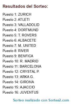 Lista de participantes: ALBACETE, BARCELONA, M. UNITED, VALLADOLID, GIRONA, JUVENTUS, R. MADRID, CRYSTAL P., BENFICA, RIVER, AJACCIO, T. ROVERS, ATLETI, ARKA G., DORTMUND, ZURICH.