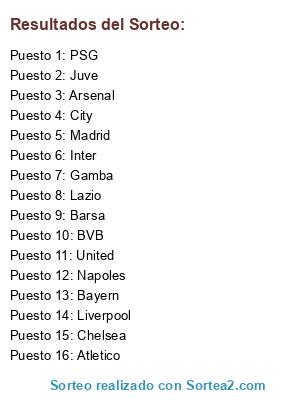 Lista de participantes: Madrid, Barsa, Bayern, Juve, Atletico, PSG, City, Arsenal, United, Liverpool, Chelsea, BVB, Lazio, Inter, Gamba, Napoles.