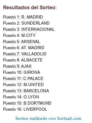 Lista de participantes: ALBACETE, ARSENAL, VALLADOLID, M.UNITED, C.PALACE, AT. MADRID, R. MADRID, B.DORTMUND, GIRONA, AJAX, O.LYON, LIVERPOOL, BARCELONA, M.CITY, SUNDERLAND, INTERNACIONAL.