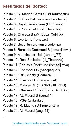 Lista de participantes: ARSENAL, AT MADRID, AT MADRID B, BETIS, BETIS B, CHELSEA, CHELSEA B, DORTMUND, DORTMUND B, EVERTON, EVERTON B, LAS PALMAS, LAS PALMAS B, LEVERKUSEN, LIVERPOOL, LIVERPOOL B, LYON, MALAGA, PSG, PSG B, LEIPZIG, LEIPZIG B, REAL MADRID, REAL MADRID B, REAL SOCIEDAD, REAL SOCIEDAD B, TOTTENHAM.