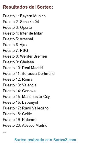 Lista de participantes: Valencia, Genova, Palermo, Chelsea, Werder Bremen, Barcelona, Celtic, Sevilla, Borussia Dortmund, Real Madrid, Arsenal, Atletico Madrid, PSG, Athletic Bilbao, Schalke 04, Oporto, Roma, Bayern Munich, Ajax, Inter de Milan, Espanyol, Rayo Vallecano, Manchester United, Manchester City.