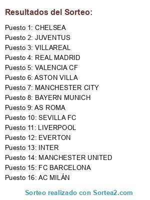 Lista de participantes: INTER, AC MILÁN, JUVENTUS, AS ROMA, REAL MADRID, CHELSEA, VALENCIA CF, MANCHESTER CITY, ASTON VILLA, EVERTON, VILLAREAL, BAYERN MUNICH, SEVILLA FC, FC BARCELONA, MANCHESTER UNITED, LIVERPOOL.
