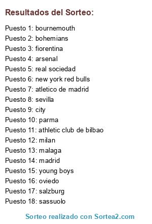 Lista de participantes: young boys, liverpool, city, united, valencia, parma, las palmas, getafe, river plate, granada, slavia, atletico de madrid, bournemouth, psg, wolfsburg, betis, madrid, fiorentina, osasuna, bohemians, new york red bulls, dormund, malaga, chelsea, arsenal, leeds, salzburg, real sociedad, athletic club de bilbao, vitesse, ajax, leipzig, sassuolo, cadiz, inter, milan, sevilla, oviedo, porto, burgos, lugo, barcelona, mallorca, lazio, wolverhampton, alaves, boca juniors, schalke.
