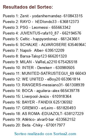 Lista de participantes: AS ROMA -EDUAZOLT- 638127229, RANGERS-messiano31- 661308939, PSG - Leomessi - 655663342, BAYER - FANDIX 625136592, MILAN - VaReLa2210 675426518, SCHALKE - ALVAROSERE 635469643, MUNITED-SATRUSTEGUI_69 660430505, BOCA - aguilera--alex 665439778, Barsa-Talop123 666201320, Zenit - yodanihernandez- 610843315, Celtic - happyordonez - 661243661, GREMIO - erLeiro - 651820493, Atlético- alvar0-bar -633562152, WE UNITED - eBoy20 653961814, JUVENTUS-rafa10_87 - 662194576, RAYO - hEDIondo33 - 636812373, INTER - Derekerr - 630980505, Betis -Chiky - 670017977, Liverpool-Jesús - 610918364, Napoli- Alber- 639512209.