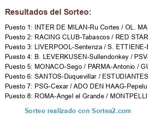 Lista de participantes: RACING CLUB-Tabascos / RED STAR-Pabloski / RED BULLS-Maxi / FLAMENGO-Ferminnn, B. LEVERKUSEN-Sullendonkey / PSV-Raiven / AJAX-Luizao / ZENIT-Tonho, LIVERPOOL-Sentenza / S. ETTIENE-Eckae / INDEPENDIENTE-Iborra / AC MILAN-Amonosparexxx, SANTOS-Duquevillar / ESTUDIANTES-Cuervo / OPORTO-Nachoeme / BARCELONA-Oskarkawa, PSG-Cexar / ADO DEN HAAG-Pepelu / CELTIC-Kalimoncho / LAZIO-Magic King, ROMA-Angel el Grande / MONTPELLIER-Betico / GALATASARAY-Bustillo / BOCA JUNIORS-Miguelillo, MONACO-Sego / PARMA-Antonio / GUANZHOU-Lucamontana / ARSENAL-McGregor, INTER DE MILAN-Ru Cortes / OL. MARSELLA-Marcos / FIORENTINA-Zeus / OL. LYON-Osdobla.