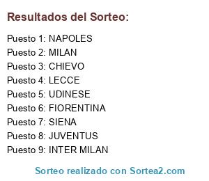 Lista de participantes: JUVENTUS, NAPOLES, FIORENTINA, LECCE, CHIEVO, INTER MILAN, MILAN, SIENA, UDINESE.