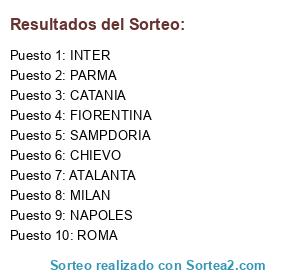 Lista de participantes: NAPOLES, CATANIA, ATALANTA, INTER, MILAN, PARMA, FIORENTINA, ROMA, SAMPDORIA, CHIEVO.