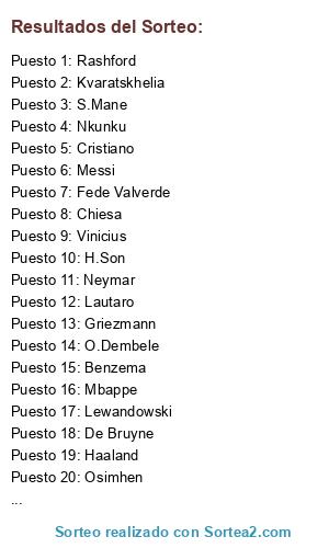 Lista de participantes: Mbappe, Vinicius, Haaland, Neymar, Salah, Messi, Benzema, Griezmann, Osimhen, Fede Valverde, Lautaro, Lewandowski, H.Son, O.Dembele, Kvaratskhelia, Nkunku, K.Coman, Rashford, L.Sane, De Bruyne, Cristiano, S.Mane, Chiesa, R.Leao.