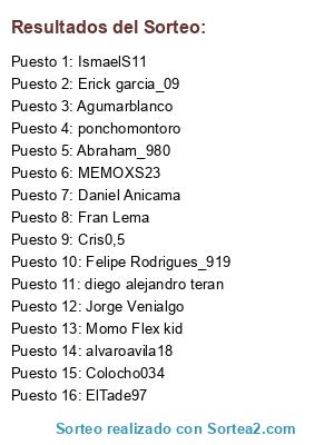 Lista de participantes: Colocho034, Fran Lema, alvaroavila18, ElTade97, Erick garcia_09, MEMOXS23, Felipe Rodrigues_919, Momo Flex kid, Jorge Venialgo, IsmaelS11, Daniel Anicama, Abraham_980, ponchomontoro, Agumarblanco, diego alejandro teran, Cris0,5.