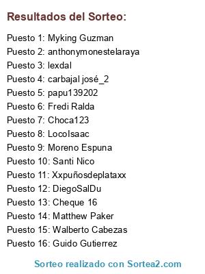 Lista de participantes: anthonymonestelaraya, papu139202, Myking Guzman, Xxpuñosdeplataxx, lexdal, LocoIsaac, Fredi Ralda, Matthew Paker, Moreno Espuna, Cheque 16, Walberto Cabezas, DiegoSalDu, Guido Gutierrez, carbajal josé_2, Choca123, Santi Nico.