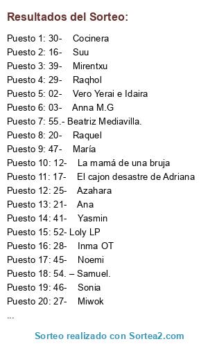 Lista de participantes: 01- Annie74, 02- Vero Yerai e Idaira, 03- Anna M.G, 04- Carol, 05- Lara, 06- Mousikh, 07- Sesi, 08- Jezabel, 09- Cartafol, 10- Sonia, 11- Mama Mimosa, 12- La mamá de una bruja, 13- La orquidea dichosa, 14- Susana, 15- Yolanda, 16- Suu, 17- El cajon desastre de Adriana, 18- Noelia, 19- Anabella, 20- Raquel, 21- Ana, 22- Madi, 23- Laura, 24- Miriam, 25- Azahara, 26- Mireia, 27- Miwok, 28- Inma OT, 29- Raqhol, 30- Cocinera, 31- Mama de Estrella, 32- Nuria Muela, 33- Pepita Dinamita, 34- Erase una vez, 35- Diana, 36- Rosa, 37- Carlota, 38- Mama de Parrulin, 39- Mirentxu, 40- Diana (Logroño), 41- Yasmin, 42- Mariona, 43- Verónica Calero, 44- Vanessa (Badalona), 45- Noemi, 46- Sonia, 47- María, 48- Clara Asin, 49- Xan, 50- Miriam (Jativa), 51- Jose, 52- Loly LP, 53.-Yporfinmamá, 54. – Samuel., 55.- Beatriz Mediavilla..