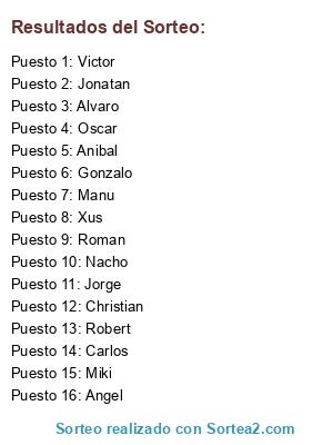 Lista de participantes: Alvaro, Angel, Anibal, Carlos, Christian, Gonzalo, Jonatan, Jorge, Manu, Miki, Nacho, Oscar, Robert, Roman, Victor, Xus.