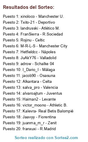 Lista de participantes: Hetfieldcc - Nápoles, Alkantara - Celta, I_Dario_I - Málaga, Haiman2 - Levante, adrow - Schalke 04, FranSierra - R.Sociedad, xinoloco - Manchester U., JuAkY76 - Valladolid, Txito-21 - Deportivo, alvaroajtum - Juventus, franxuxi - R.Madrid, Jaavyy - Fiorentina, salva_pro - Valencia, landrusski - Atlético M., Rojinu - Celtic, juanma_m_r - Zenit, jacob90 - Osasuna, M-R-L-S - Manchester City, victor_moono - Athletic B., Kalevra- Real Betis Balompié.