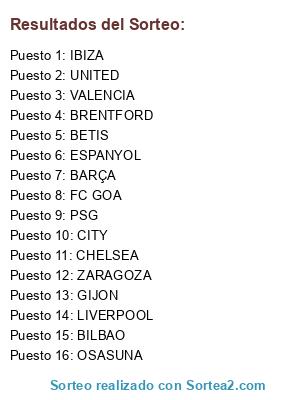 Lista de participantes: CHELSEA, BARÇA, MADRID, GOA, ZARAGOZA, LIBRE1, LIBRE2, LIBRE3, LIBRE4, LIVERPOOL, BAYERN, ESPANYOL, IBIZA, UNITED, ATHLETIC, BRENTFORD.