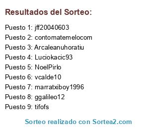 Lista de participantes: Luciokacic93, jff20040603, Arcaleanuhoratiu, vcalde10, contomatemelocom, NoelPirlo, marratxiboy1996, tifofs, ggalileo12.