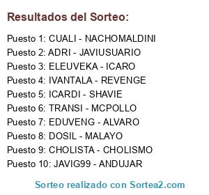 Lista de participantes: CUALI - NACHOMALDINI, JAVIG99 - ANDUJAR, DOSIL - MALAYO, IVANTALA - REVENGE, EDUVENG - ALVARO, CHOLISTA - CHOLISMO, ELEUVEKA - ICARO, TRANSI - MCPOLLO, ADRI - JAVIUSUARIO, ICARDI - SHAVIE.