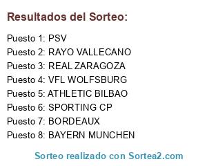 Lista de participantes: RAYO VALLECANO, REAL ZARAGOZA, BAYERN MUNCHEN, BORDEAUX, ATHLETIC BILBAO, PSV, VFL WOLFSBURG, SPORTING CP.