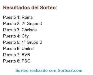 Lista de participantes: PSG, Roma, BVB, City, Chelsea, United, 1º Grupo D, 2º Grupo D.