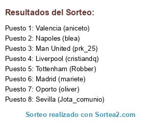 Lista de participantes: Sevilla (Jota_comunio), Valencia (aniceto), Madrid (mariete), Man United (prk_25), Tottenham (Robber), Liverpool (cristiandq), Napoles (blea), Oporto (oliver).
