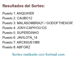 Lista de participantes: ARCINIUS1989, SUPERDINHO, ABFORZ, JONY-CAPIYOU123, JAVILOTA_14, CAUBO12, ANQUIHER, MALASOMBRA21 / GODOFTHENORTHSS.