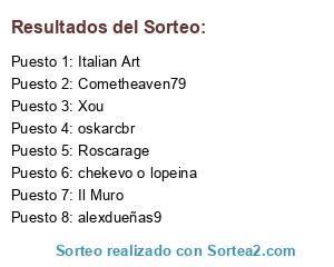 Lista de participantes: alexdueñas9, Cometheaven79, Xou, oskarcbr, chekevo o lopeina, Italian Art, Roscarage, Il Muro.