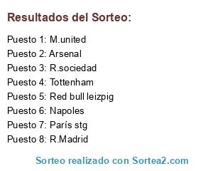 Lista de participantes: Tottenham, R.Madrid, M.united, R.sociedad, Arsenal, Red bull leizpig, París stg, Napoles.