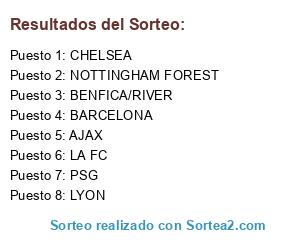 Lista de participantes: BENFICA/RIVER, NOTTINGHAM FOREST, AJAX, LA FC, PSG, BARCELONA, LYON, CHELSEA.