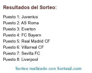Lista de participantes: FC Bayern, Sevilla FC, AS Roma, Everton, Villarreal CF, Juventus, Liverpool, Real Madrid CF.