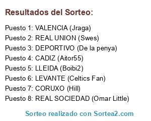 Lista de participantes: CADIZ (Aitor55), DEPORTIVO (De la penya), LLEIDA (Boibi2), CORUXO (Hill), REAL SOCIEDAD (Omar Little), LEVANTE (Celtics Fan), VALENCIA (Jraga), REAL UNION (Swes).