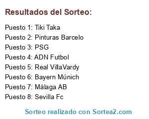 Lista de participantes: Sevilla Fc, Málaga AB, Real VillaVardy, Tiki Taka, ADN Futbol, Bayern Múnich, Pinturas Barcelo, PSG.