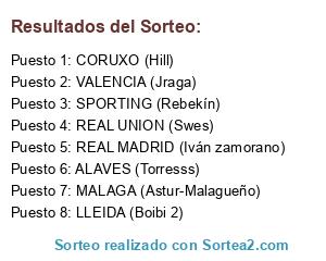 Lista de participantes: SPORTING (Rebekín), MALAGA (Astur-Malagueño), LLEIDA (Boibi 2), REAL MADRID (Iván zamorano), CORUXO (Hill), REAL UNION (Swes), VALENCIA (Jraga), ALAVES (Torresss).