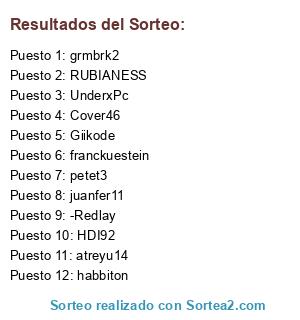 Lista de participantes: Franns, -Liricox, -Redlay, -PreSSion, -Juanlu011, Kroos18, evolucion, PeterMcDowell, higodefruta, Ouka Leele, Kaiser32, Dawidek, HDI92, -Tyr-, "Sin cuenta de forocoches nº1", Grumpy cat, cornerkel, Firecraft, Jna, r0b3rz, ManMatao, VV ®, nestorillo14, medicensamuel, elvigia, Giikode, zoropurgui, Suciosocio, UnderxPc, Capitan Tumaca, Dioni Walker, socramazo, Fankonnen, Hdcluster, mefollomiradas, Chilaba, rEd uNdErGrOuNd, knockout, juanan.betis, Sin cuenta de forocoches nº2, Baneado, ismailove, betabetada, betabetada2, Sin cuenta de forocoches nº3, Mot4, Saexfer, SuXaR, J.Gramos Largos, WhiteFC, CrimsomOne, mjordan07, Ipa-K92, davidman, Sin cuenta forocoches nº3, Pit, lavie, skirol, El Chon Gordo, albertocp5, erastotene, xenon32, passit14, dxqlo, juanfer11, RMoreno17, Houcor, blindman_, alexgemelo, genaro44_, peroquecoj, carloscasv, abeluqui, pep500, fidodido10, atreyu14, oram, algadiot, sokom7, wigam, Pesk1, RUBIANESS, axyus, Pepssi19, Plateau, bartun, nomerallo, Kotake, Radiactiv0Man, Fool Smurf, Cover46, alopezzzz, gabyno, sin cuenta de forocoches nº4, ninja16, luareli, tecnograna, Sin cuenta forocoches nº5, javive, pynkus, dongrunchon, ganyaparty, mawel2, Fornicador, franckuestein, kikekaro, habbiton, yosoybar, Ziskin, pixelypunto, petet3, elnuevotas, fazer08, Kenji_Rage, JRZ., Adolfo974, Fonz, Cesar143W, TodosPatos, Davoselli, Guaje.i30, fgt24, verunce, Sin cuenta forocoches nº6, rafaarv, Gennaro, ROSBERG, tronaderas, Adrian93, marzelinor, jdjoder, esojesoj2, grmbrk2, MANOLI67.
