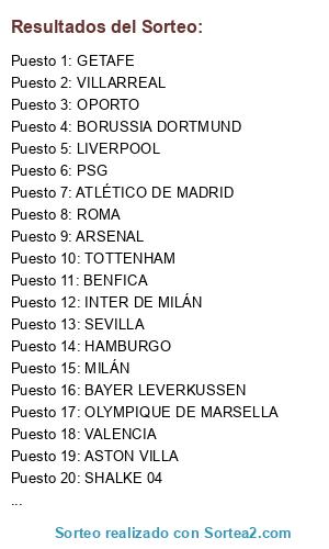 Lista de participantes: INTER DE MILÁN, ATLÉTICO DE MADRID, BAYERN DE MUNICH, VALENCIA, MANCHESTER CITY, SEVILLA, LIVERPOOL, MILÁN, JUVENTUS, LYON, TOTTENHAM, OPORTO, BENFICA, VILLARREAL, BAYER LEVERKUSSEN, BORUSSIA DORTMUND, GETAFE, ASTON VILLA, OLYMPIQUE DE MARSELLA, ARSENAL, ROMA, SHALKE 04, HAMBURGO, PSG.