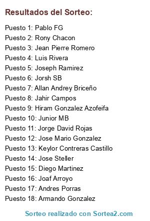 Lista de participantes: Hiram Gonzalez Azofeifa, Joaf Arroyo, Andres Porras, Armando Gonzalez, Pablo FG, Junior MB, Luis Rivera, Jose Steller, Jose Mario Gonzalez, Jahir Campos, Allan Andrey Briceño, Diego Martinez, Jean Pierre Romero, Jorsh SB, Jorge David Rojas, Rony Chacon, Joseph Ramirez, Keylor Contreras Castillo.