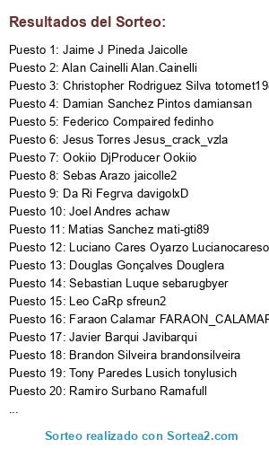 Lista de participantes: Vitor Santos Canuto Vitorsfc, Brandon Silveira brandonsilveira, Jorge Meler Blitz, Haider Vanegas haider13, Julio Santos mad_evil, Rodolfo Roggero fitofarais, Jorge Cartes jncartes, Red Red elmonodaniel, Maxi Quiroga themaxiquiroga, Luciano Cares Oyarzo Lucianocareso, Matias Sanchez mati-gti89, Ramiro Surbano Ramafull, Christopher Rodriguez Silva totomet1986, El Chila Vazquez Vega elchila2014, Jesus Torres Jesus_crack_vzla, Marcelo Adrian alvaradomdp, Javier Guastini Guasti, Javier Barqui Javibarqui, Faraon Calamar FARAON_CALAMAR, Jaime J Pineda Jaicolle, Matias Barbero pasquenze, Criz Tiann jagerx, Alan Cainelli Alan.Cainelli, Joel Andres achaw, Sebastian Luque sebarugbyer, Sebas Arazo jaicolle2, Douglas Gonçalves Douglera, Mauricio Acevedo Lagos Chubaka, Luis Torres luisinho_crack, Naniquio Perez jugador1, Tony Paredes Lusich tonylusich, Federico Compaired fedinho, Mauro Sanchez kurilin, Ookiio DjProducer Ookiio, Da Ri Fegrva davigolxD, Leo CaRp sfreun2, Roman Pes Roman.D.W, Damian Sanchez Pintos damiansan, Jhonny García jhojagaca, Juan Carlos Soto JuanKStigma.