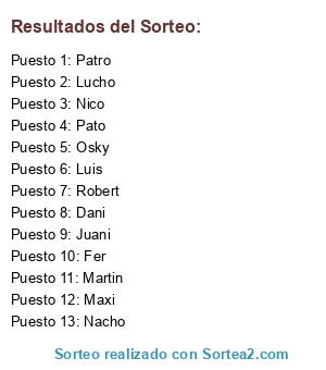 Lista de participantes: Nacho, Lucho, Martin, Nico, Osky, Dani, Fer, Robert, Patro, Maxi, Pato, Luis, Juani.