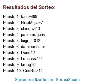 Lista de participantes: daminoobster, facu9499, CrisRuiz14, Luucass777, paolouruguay, Dario12, kroug10, luigi_-2012, NicoMejia97, chinoavl13.